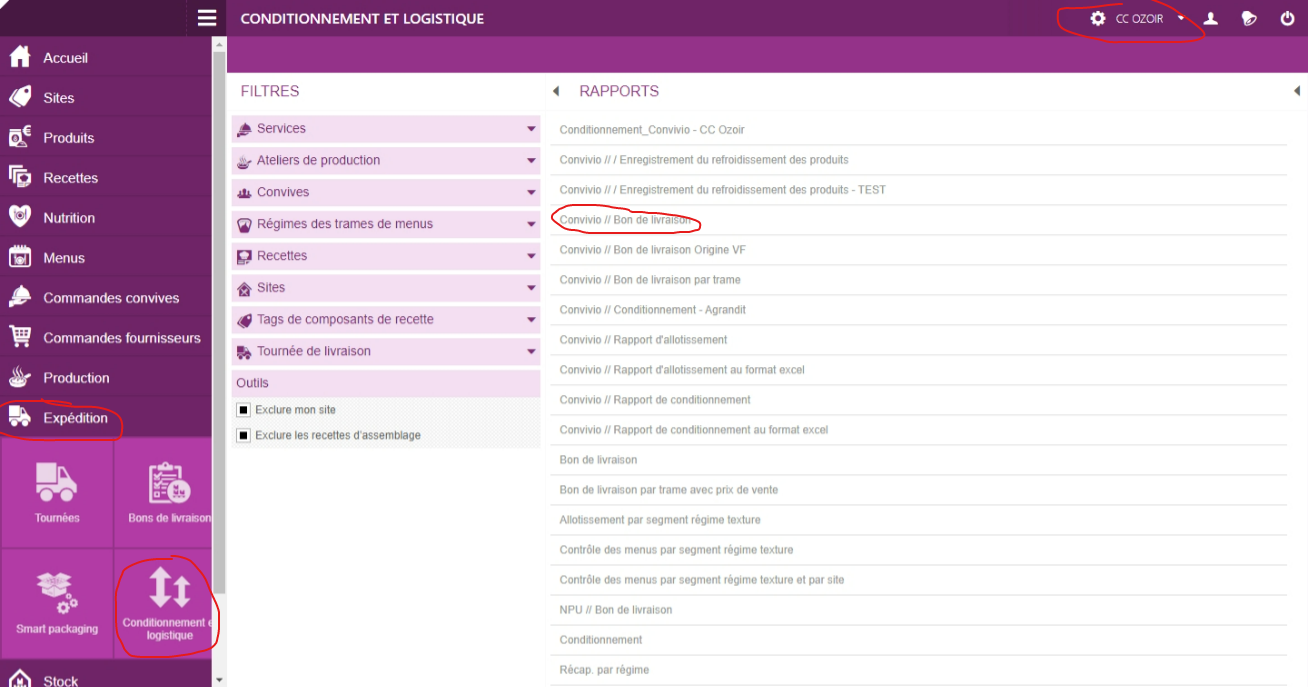 Se connecter à ARGOS, aller dans Expédition -> Conditionnement et logistique -> Convivio // Bon de livraison