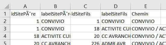 Ouvrir le fichier directement avec Excel entrainera des problèmes avec les accents et les caractères spéciaux. Le contenu du fichier d’exemple ci-dessous ne correspond pas mais la procédure est la même.