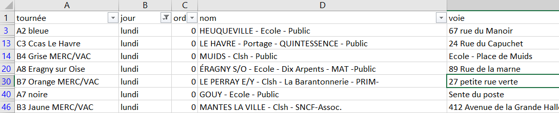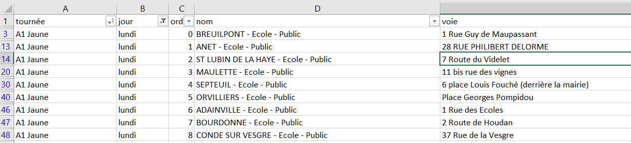 Le fichier contient le nom de la tournée, le jour de la tournée, l’ordre des sites dans la tournées, le nom du site livré, l’adresse de livraison.