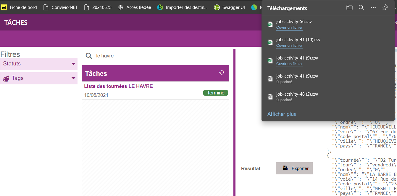 Une fois les données à jour, en bas de l’onglet de droite cliquer sur Exporter pour télécharger le fichier « job-activity-56.csv »