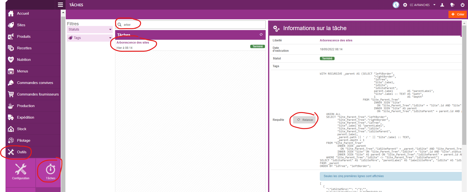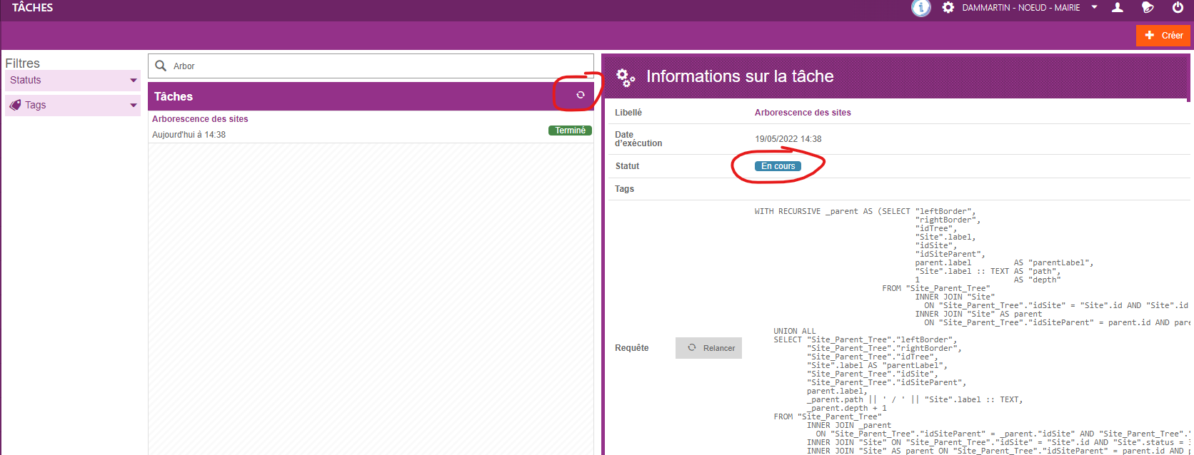 - je clique sur relancer, la tache va se mettre à jour pour récupérer même les derniers sites créés. Cela prend moins de 5 secondes et la tache devrait passer au statut en cours