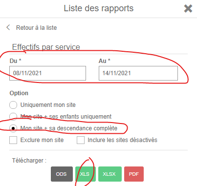 Sélectionner la période d’intérêt puis dans le cas d’un nœud sélectionner mon site + sa descendance complète -> XLS.