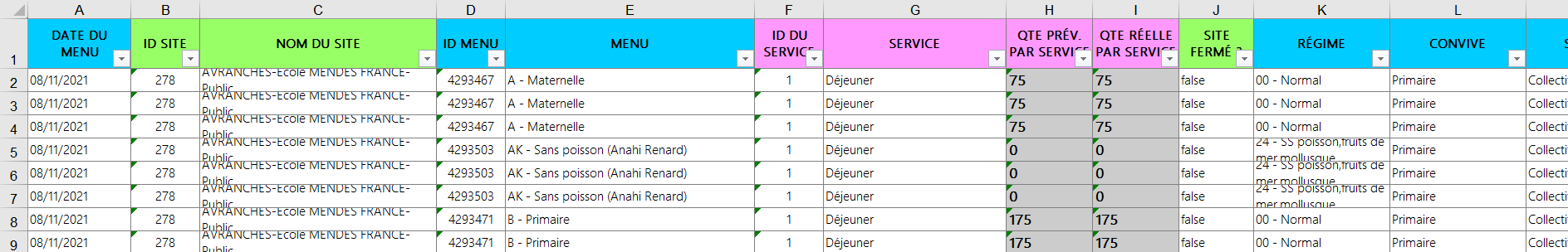 Le fichier obtenu résume pour chaque date (colonne A), pour chaque site (colonne C), pour chaque trame de menu (colonne E), pour chaque service (colonne E) les quantités prévisionnelles et réelles (colonnes H et I).