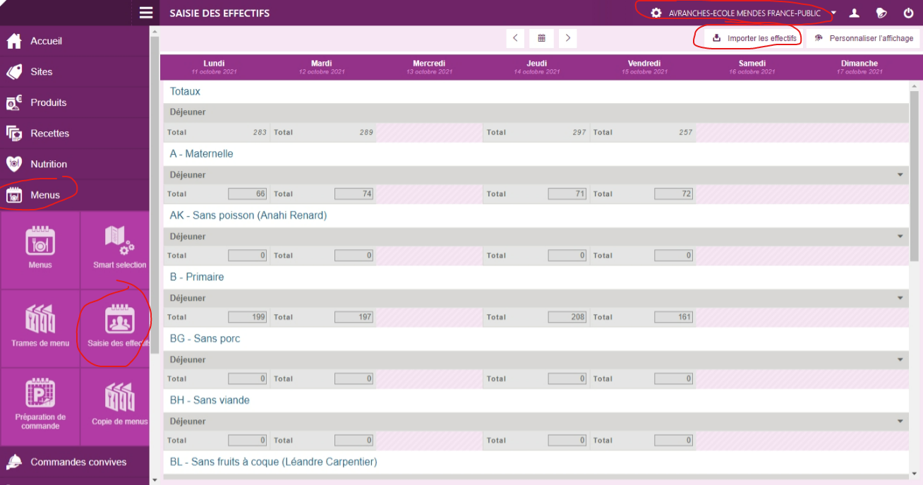 Attention l’import ne fonctionne qu’au service et pas à l’élément de repas.