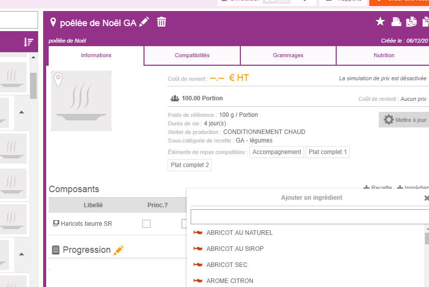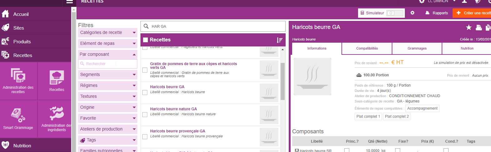 *j’ouvre l’onglet "Recettes" -> "Administration des recette" et appelle dans la fenêtre de recherche une recette qui ressemble à celle que je veux créer, dans mon exemple je prends haricots beurre GA pour faire une autre recette de légumes qui utilisera les mêmes grammages convives.