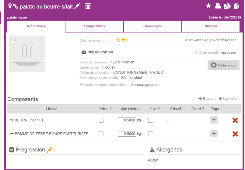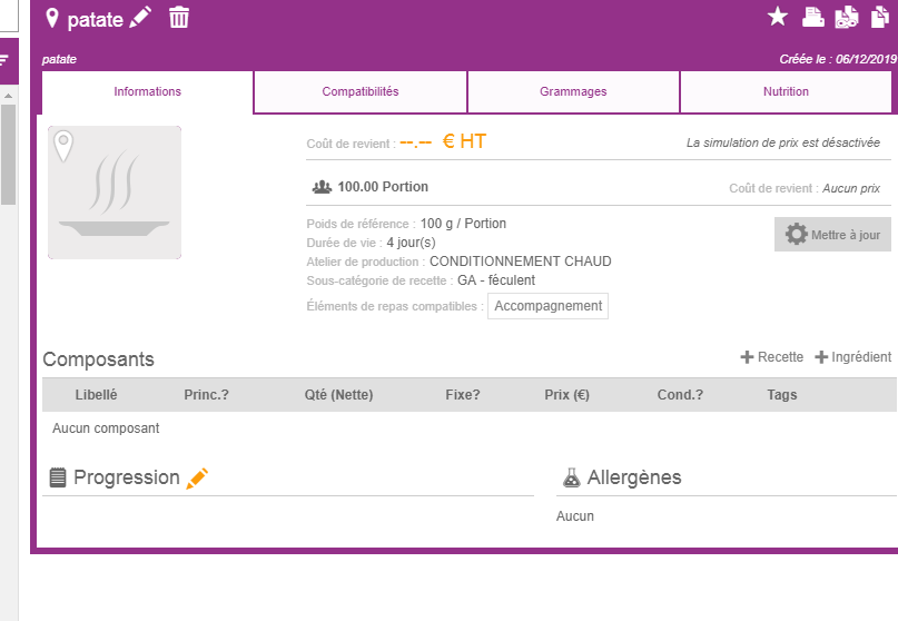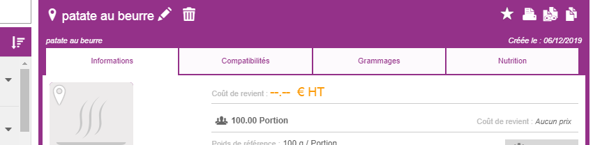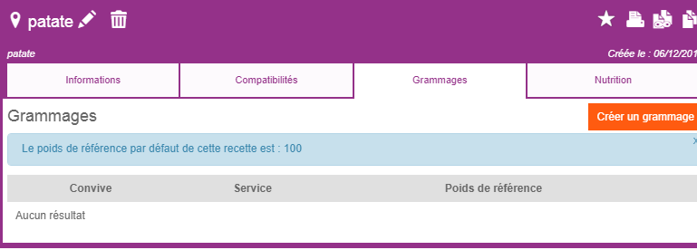 *Dans une recette en partant de rien je dois créer des grammage (si c’est une recette à la portion ou à la pièce)