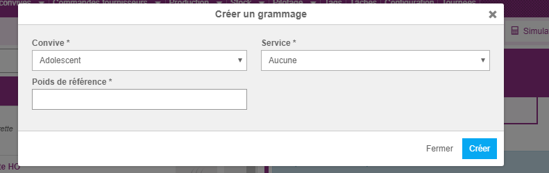 *je choisis un convive, un service et le poids de la pièce ou de portion que je souhaite lui servir et termine en cliquant sur créer.