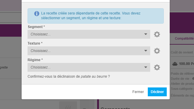 *je peux décliner cette recette pour un régime ou un allergène, pour ce faire je clique sur le symbole « décliner la recette »