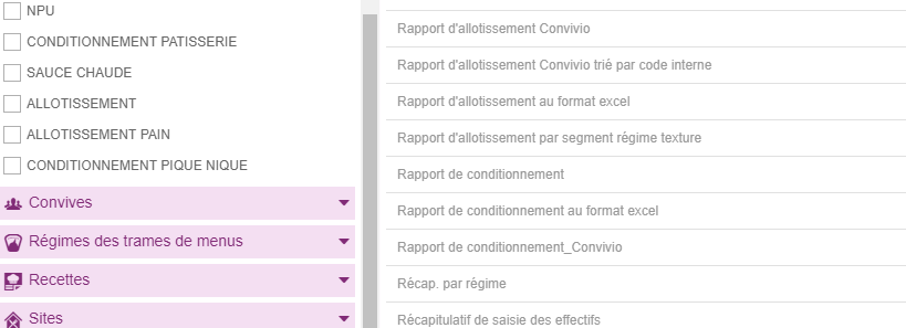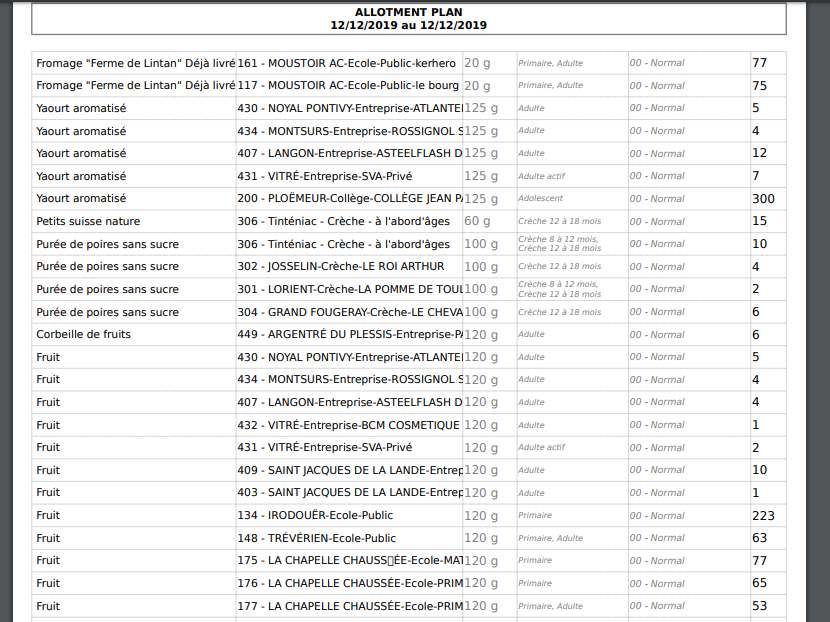 *je ne retrouve dans ce rapport que les recettes pour lesquelles nous avons mis en atelier de production « allotissement », ce sont des recettes qui ne nécessitent pas de conditionnement en barquettes, seul un chiffre global pour le client apparaît,