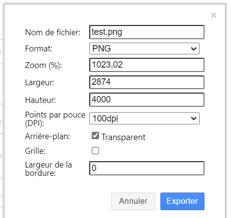Attention dans le cas de grand diagramme l’affichage peut se retrouver coupé. Pour éviter ce genre de cas utilisez le format « Avancé », ainsi vous pourrez modifier la largeur et la hauteur d’export afin d’avoir de grandes images.