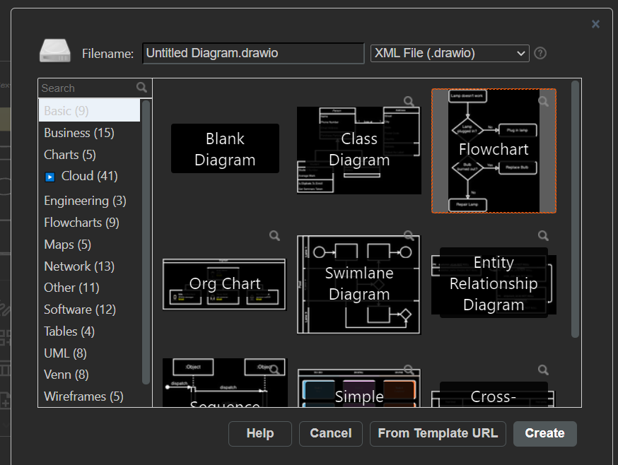 Commençons un simple Flowchart en cliquant sur create. On me demande où je veux enregistrer le fichier sur mon ordinateur :