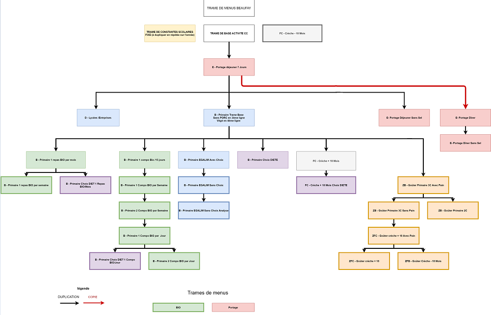 - Les flèches correspondent à des duplications ou des copies de menus.