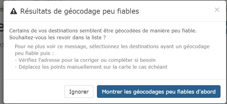 Il se peut que certains sites soient moins bien géolocalisés que les autres (adresse imprécise, numéro de rue manquant, …), MapoTempo va donc proposer de montrer ces sites en premiers afin d’affiner manuellement la géolocalisation.