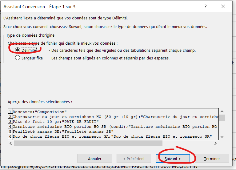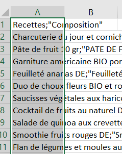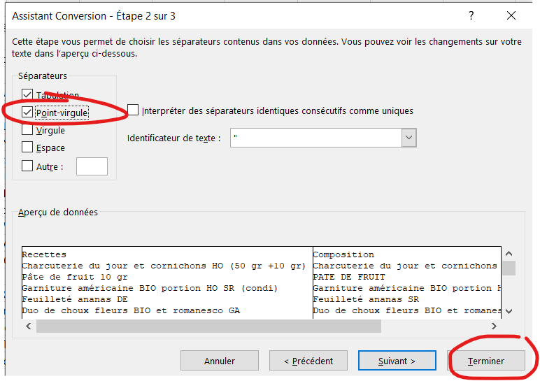 Les 2 colonnes apparaissent dans la même colonne Excel. Sélectionner la colonne A -> Données -> Convertir -> Délimité -> Suivant -> Cocher « ; » -> Terminer.
