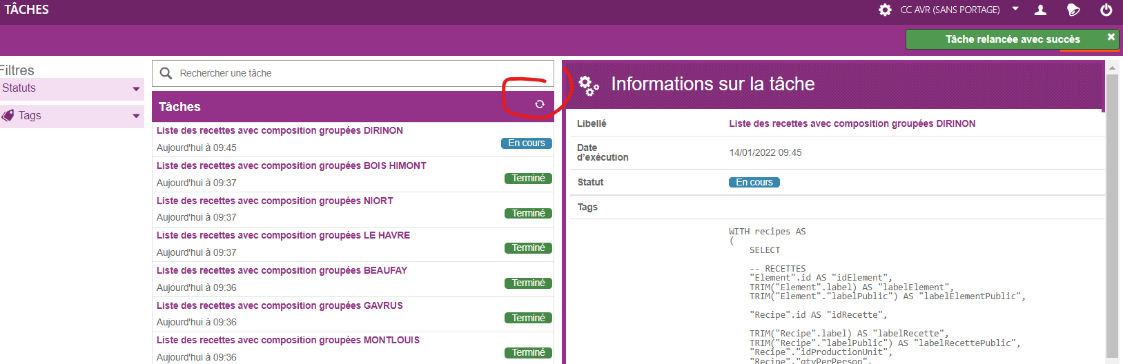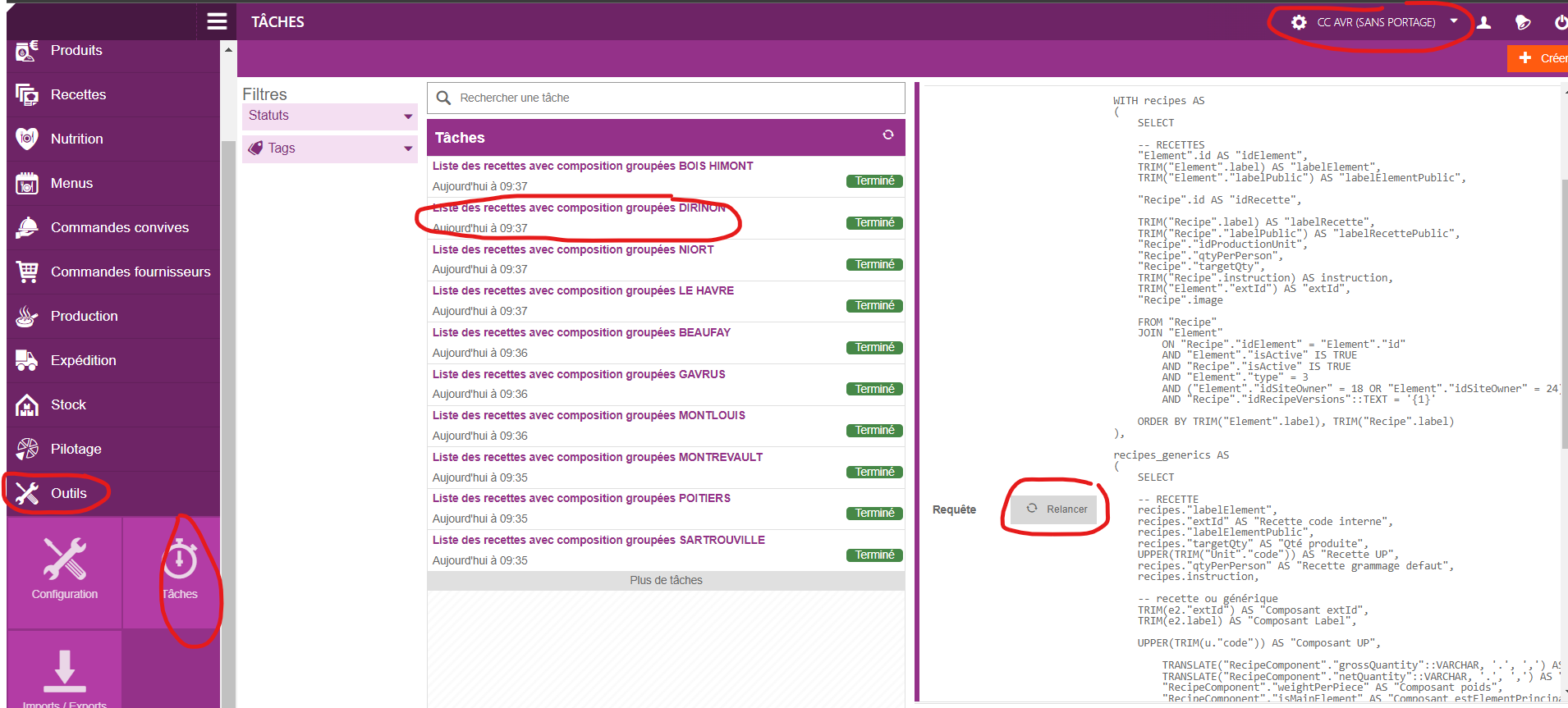 Sur n’importe quel site dans ARGOS il est possible d’aller dans les Outils -> Taches -> Liste des recettes avec composition groupées DIRINON -> Relancer.