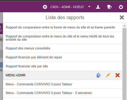 Aller sur la page permettant d’exporter le rapport (ex : Menus -> Menus ou Expéditions -> Conditionnement & logistique ou Production -> Production).