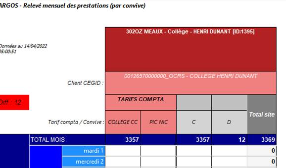 Dans le dossier "factures validées sans correction" sont déjà présents les relevés correspondant aux sites qui ont le TAG facturation directe sans control. Ces factures seront envoyés directement aux clients sans modification par le service de comptabilité il est nécessaire de vérifier que les effectifs sortiront bien sur la facture finale du client. Comme ces factures fonctionnaient déjà bien les mois précédents il est possible de faire un control plus rapide que pour les autres : en validant qu'il n'y a pas de différence entre le total des effectifs dans les colonnes grises (ARGOS) et les colonnes rouges (comptabilité). Une cas "différence" a justement été mis en place pour faciliter ce contrôle :