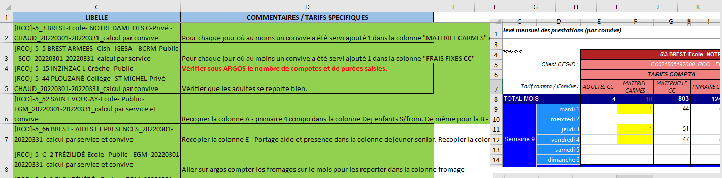 Vérifier une centaine de relevés d'effectifs indiquant dans des colonnes grises les effectifs extraits d'ARGOS et dans des colonnes rouges les effectifs qui seront facturés au client. L'objectif est simplement de vérifier que tout ce qui a été produit sera bien facturé au client.
