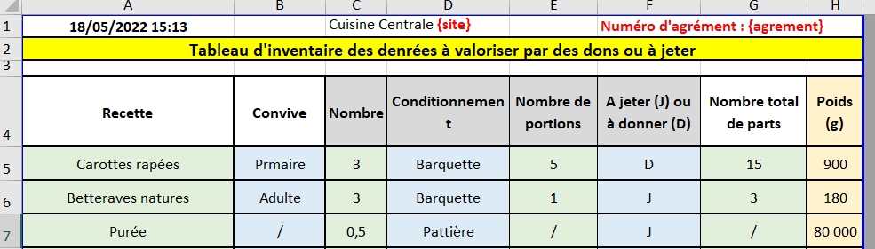 Un tableau permettant le suivi journalier des déchets et des dons a été mis en place. Celui-ci permet de renseigner sur chaque ligne :