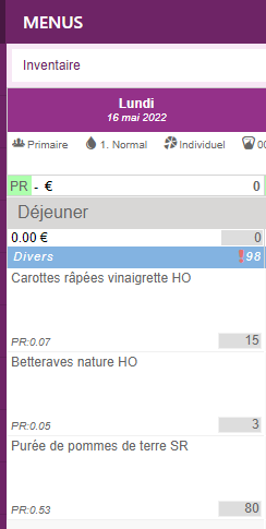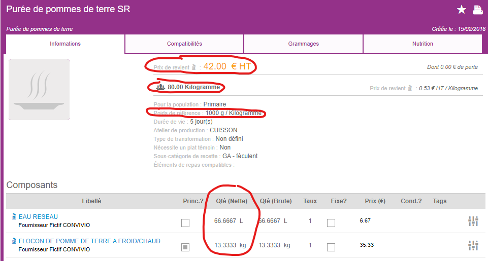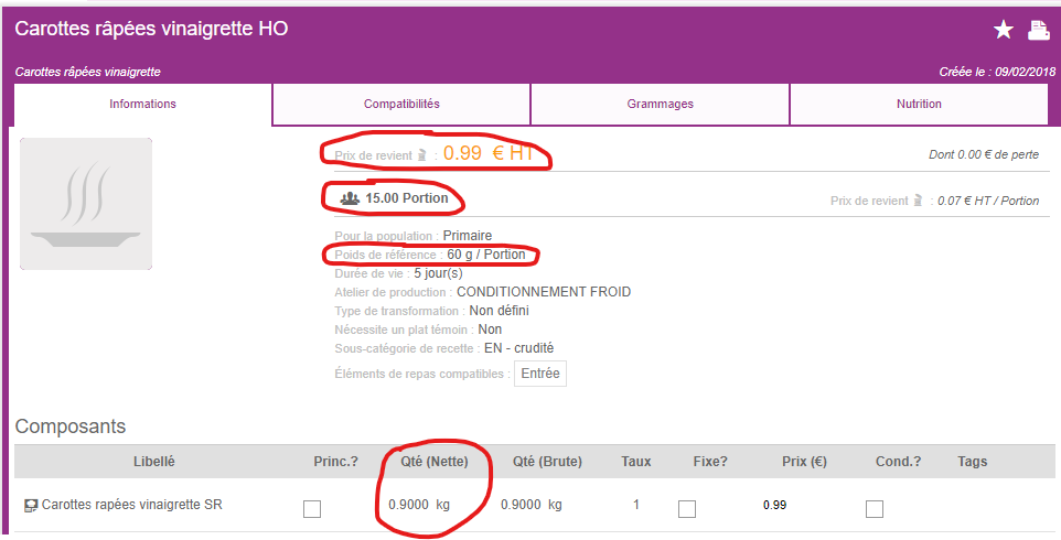 Dans les cas des recettes conditionnées je choisis la recette en HO/GA/PP/PL/DE puis de saisis le nombre de portions. En cliquant sur l’œil je peux retrouver en autre les informations de :