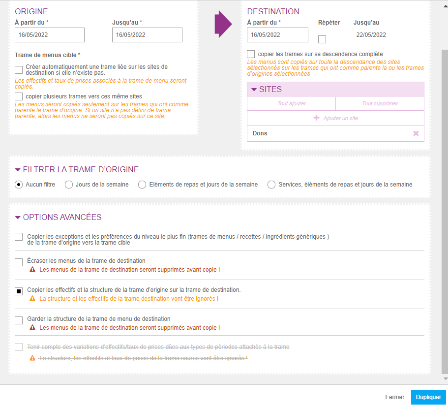 Je peux dupliquer la trame de manu Inventaire vers le site Don pour copier l’intégralité de l’inventaire en copiant les effectifs de la trame de de menu d’origine :