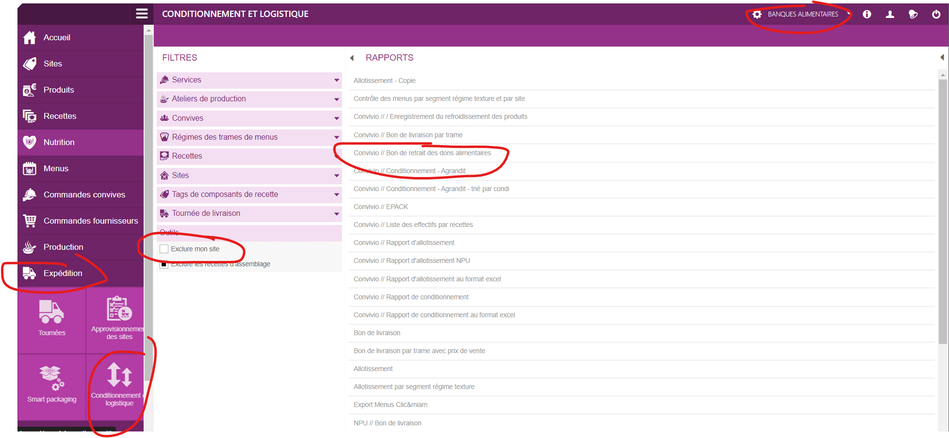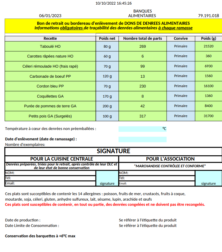 Dans ARGOS sur le site des dons dans Expédition -> Conditionnement et logistique, choisir le rapport Convivio // Bon de retrait des dons alimentaires sur les dates concernées et le format puis télécharger.