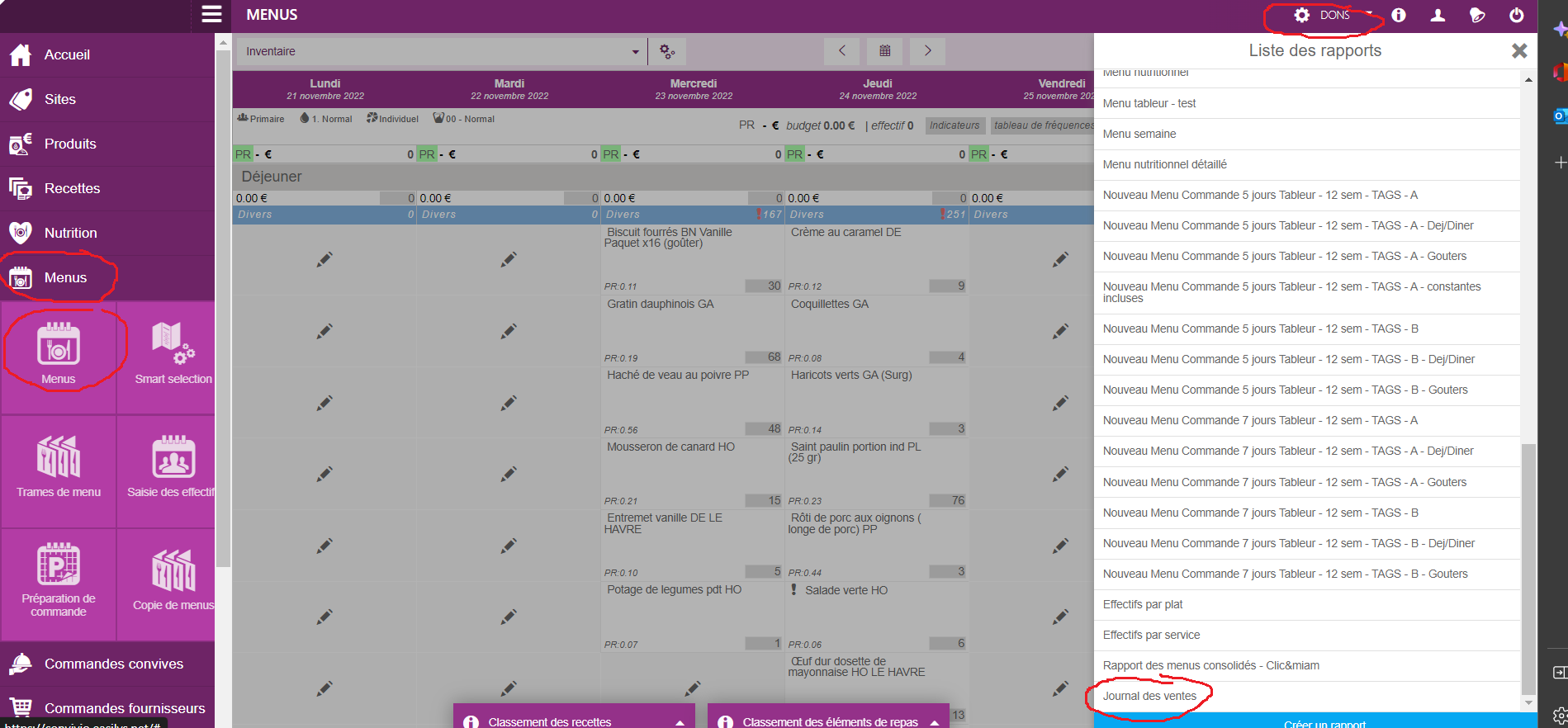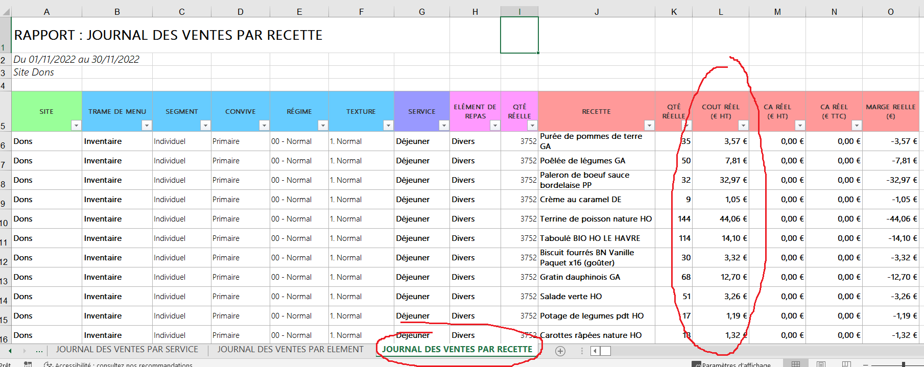 Ouvrir le fichier qui se télécharge alors. Pensez à activer les modifications puis dans la dernière feuille du fichier "JOURNAL DES VENTES PAR RECETTE" vous retrouverez toutes les informations nécessaires : recette, quantité, cout ... :