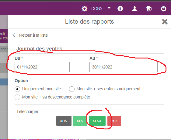 Il est ensuite nécessaire de quantifier le montant correspondant aux dons effectués. Pour cela sue le site "Dons" dans Menus -> Menus -> Rapport -> Journal des ventes -> Sélectionner la période d'intérêt -> XLSX -> Télécharger :