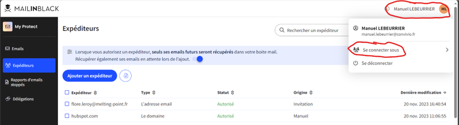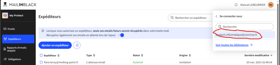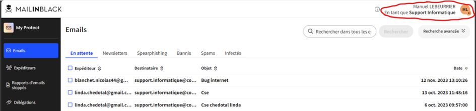 Il est possible que votre adresse mail fasse partie d’un groupe. Par exemple dans mon cas je suis dans le groupe support_informatique@convivio.fr. Je peux donc avoir des mails bloqués non pas dans les SPAMs de mon adresse mail manuel.lebeurrier@convivio.fr mais dans les SPAMs du support. Pour cela je peux changer de profil une fois connecter dans MailInBlack pour me connecter sous le nom de mon groupe :