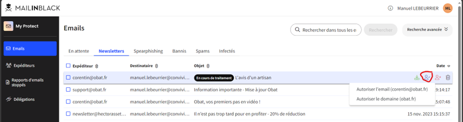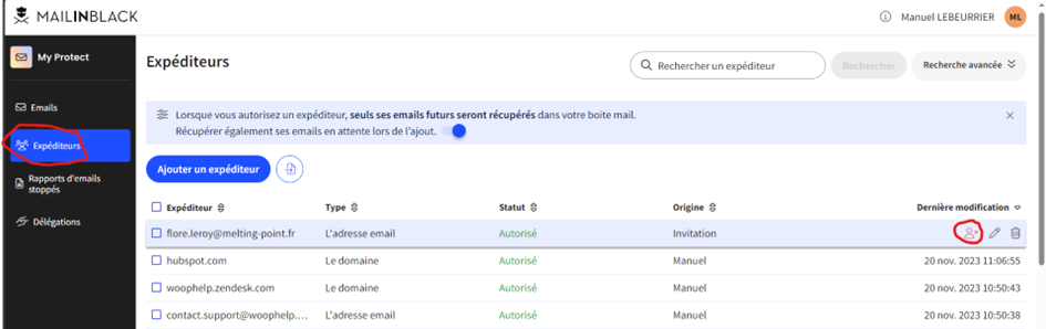 Comme une erreur peut toujours arriver, sachez qu’il est possible de changer un expéditeur de bannis vers autorisés et inversement dans l’onglet expéditeur :