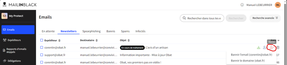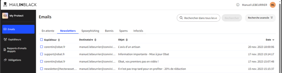 - Bannis : Les mails dont les destinataires sont dans la liste noire.