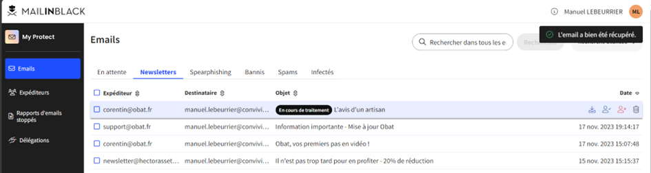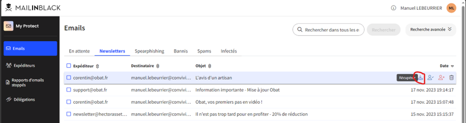 Afin de récupérer un mail bloqué dans les SPAMs il suffit de trouver le mail recherché dans la liste des mails de la bonne catégorie et de cliquer sur récupérer :