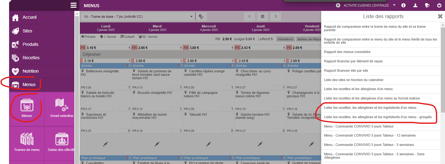 Pour cela il suffit d'aller dans Menus -> Menus -> choisir sa trame de menu -> Rapports -> Lister les recettes, les allergènes et les ingrédients d'un menu (groupé ou non) :