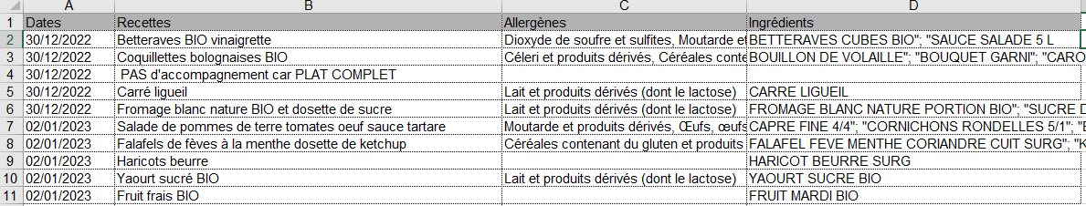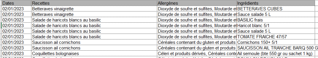 Attention dans la colonne les ingrédients sont séparés par des ; .