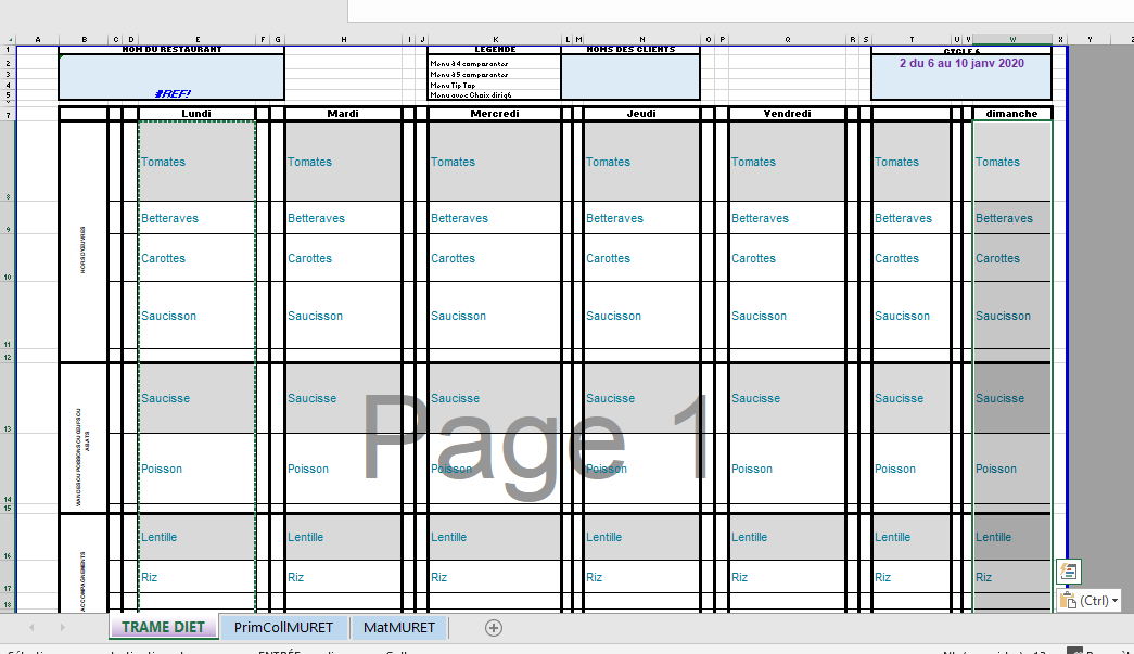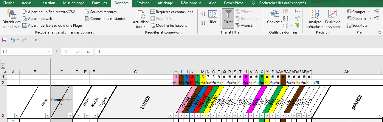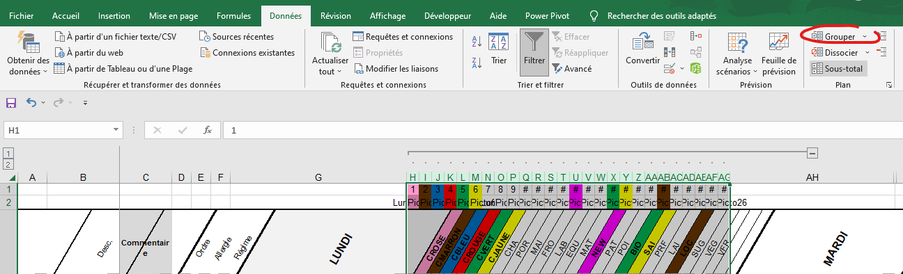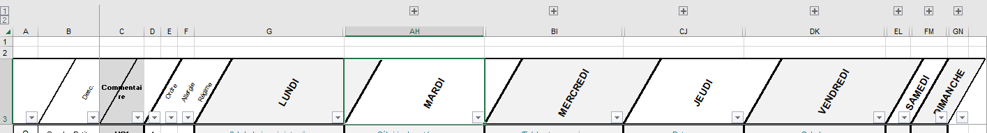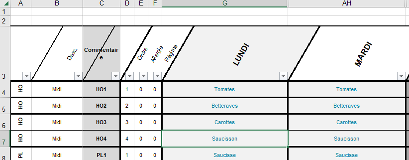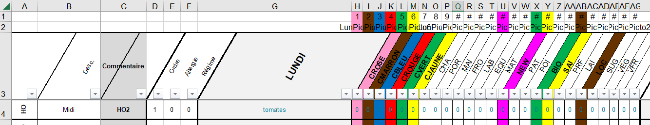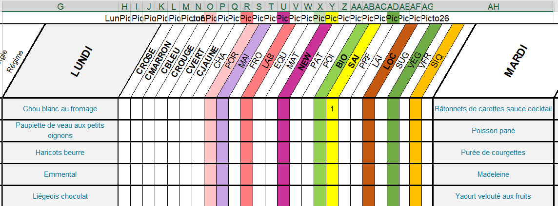 - Dans les colonnes H à AG : à partir de la 4ème ligne les pictogrammes des recettes du lundi.