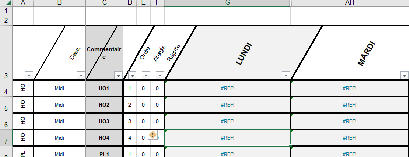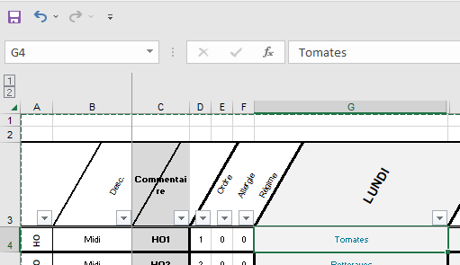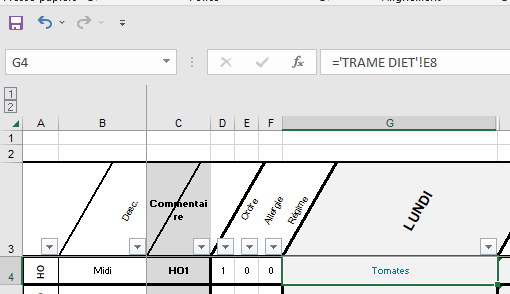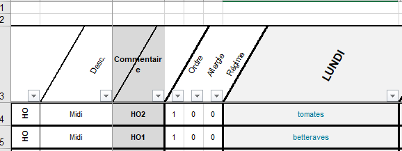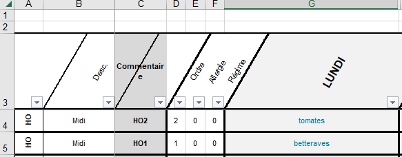 - Dans la colonne A : à partir de la 4ème ligne des abréviations correspondant aux éléments de repas = HO/PL/GA/LT/DE/GT.