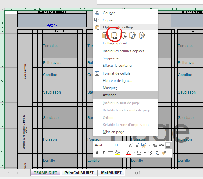 En fait clic et miam qui est en train de lire la feuille "PrimCollMURET" va être obligé de retourner sur la feuille "TRAME DIET" de parcourir toutes les cellules jusqu'à trouver la cellule E8 et copier son contenu. Puis clic & miam va retourner sur la feuille "PrimCollMURET" pour lire la cellule en dessous. Il va trouver (='TRAME DIET'$E9) et est donc obligé de retourner sur la feuille "TRAME DIET" et ainsi de suite. Ainsi au lieu d'importer en quelques secondes une feuilles Excel clic & miam va mettre quelques minutes à faire le même travail. Ralentissant ainsi tout le monde. Une seule solution éviter les références pour ce la se référer au point I.