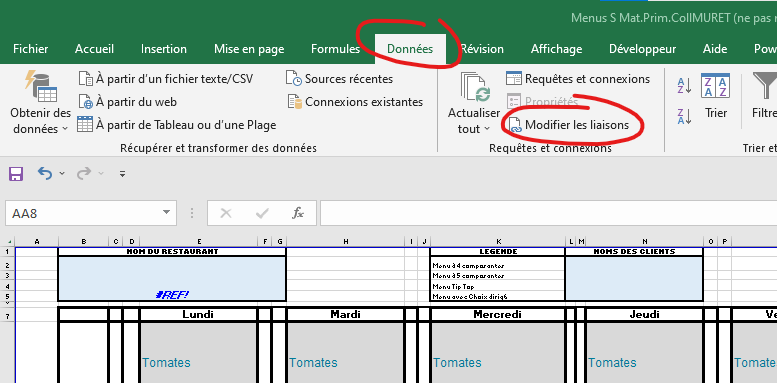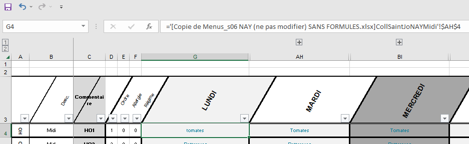 Si vous avez de dire que le HO1 du LUNDI se trouve non pas dans le fichier Excel mais dans un autre de votre ordinateur ou du serveur nommé par exemple : Copie de Menus_s06 NAY (ne pas modifier) SANS FORMULES.xlsx