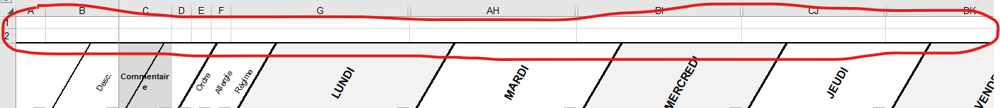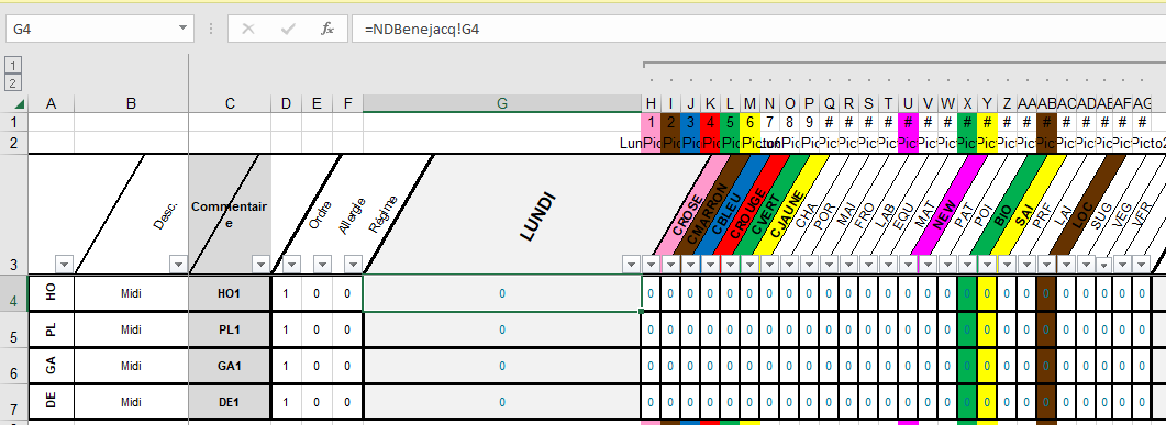 - Dans les colonnes CK à DJ : à partir de la 4ème ligne les pictogrammes des recettes du jeudi.