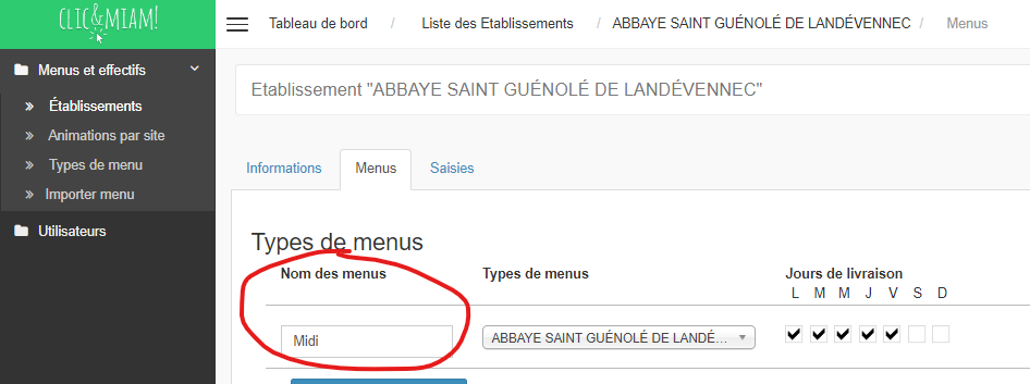 - Dans la colonne B : à partir de la 4ème ligne des descriptions correspondant aux noms des menus. Que l'on retrouve dans l'administration de l'établissement :