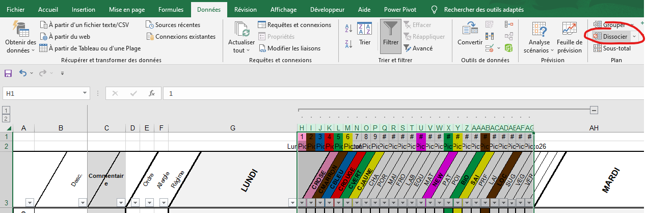 - Colonne G : LUNDI puis tous les pictogrammes du lundi