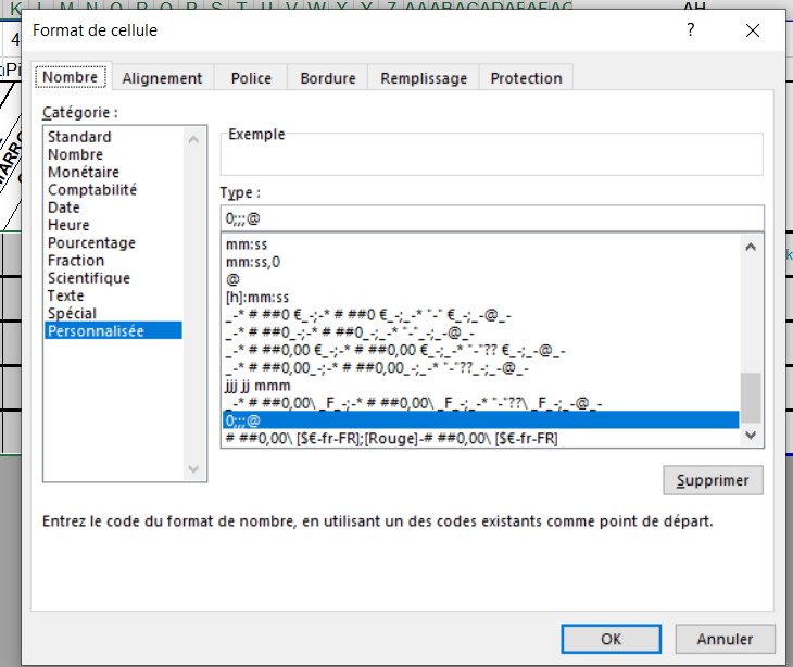 Dans "Format de cellule" -> Type préciser 0;;;@ (zéro + point virgule + point virgule + point virgule + arobase) -> OK :