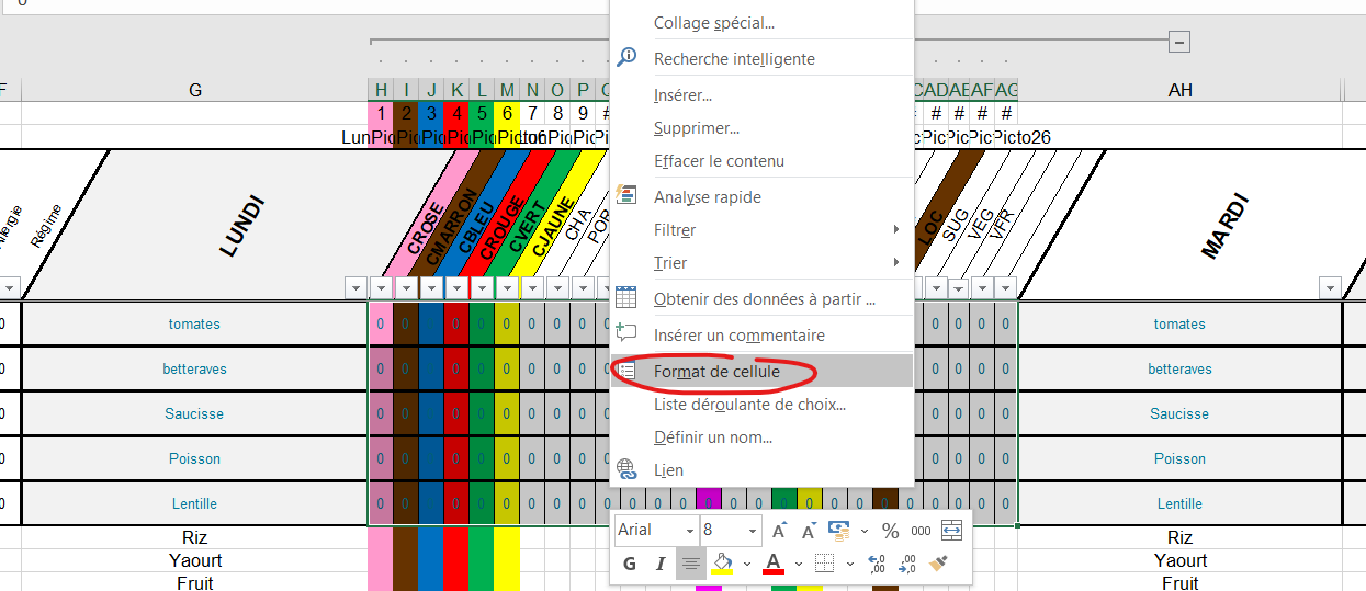 - Dans les colonnes AI à BH : à partir de la 4ème ligne les pictogrammes des recettes du mardi.