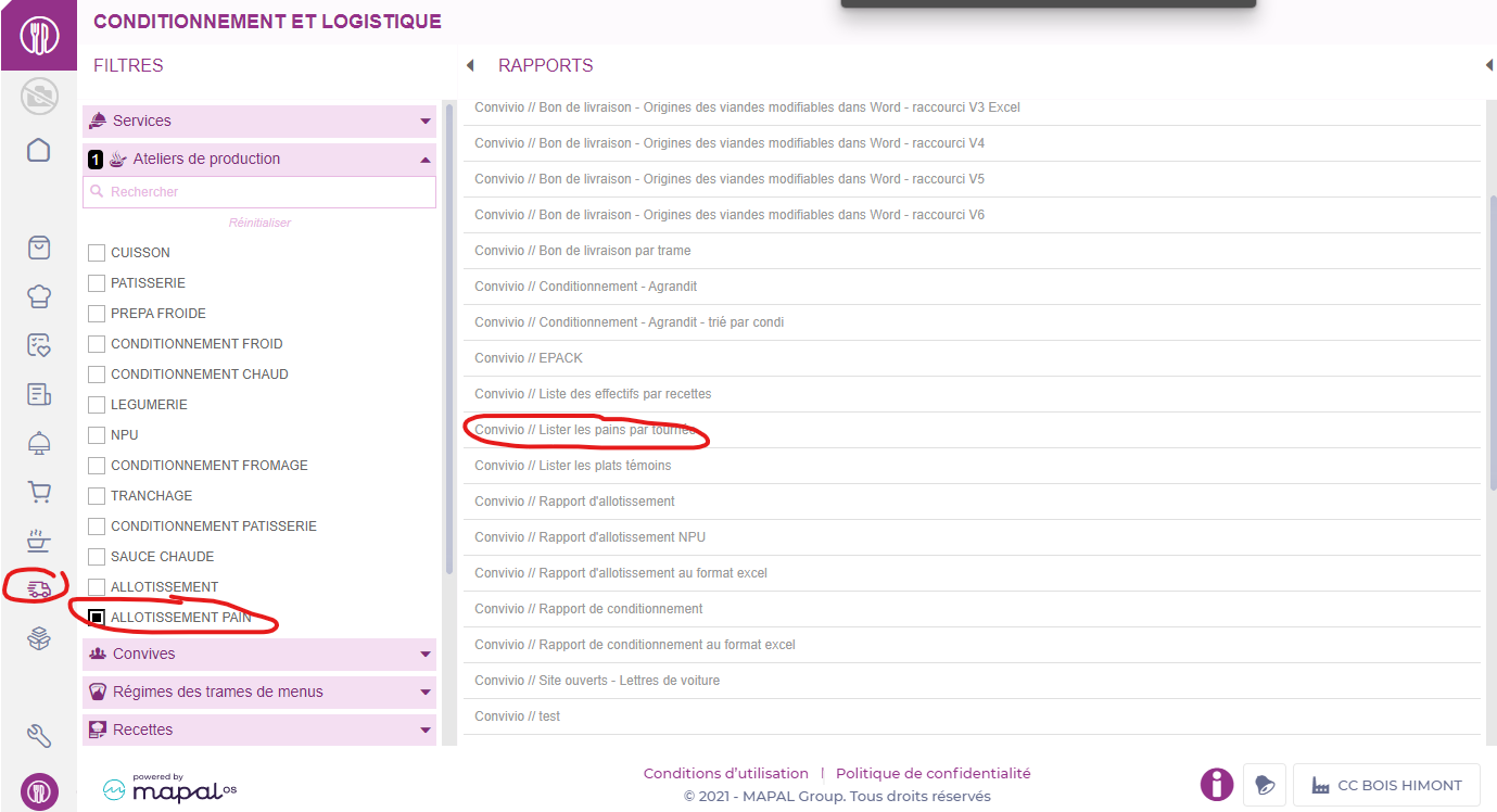 Sur ma CC dans Expédition -> Conditionnement et logistique -> Filtrer les ateliers de production sur l'allotissement pain -> puis le rapport Convivio \\ Lister les pains par tournée :