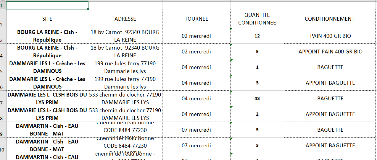 Ce fichier peut être fourni au livreur afin de préciser les quantités de pain à livrer sur chaque site.