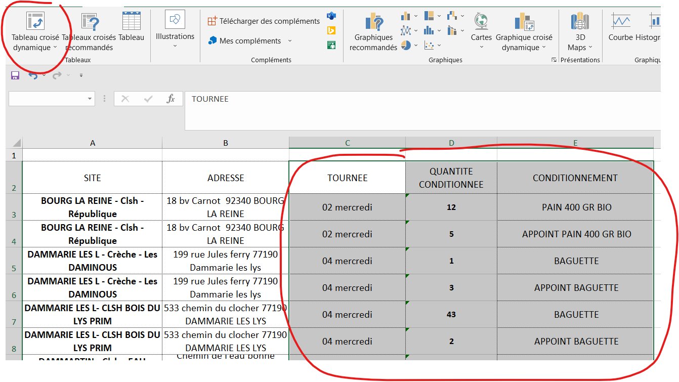 Sélectionner les 3 colonnes : tournée, quantité conditionnée, conditionnement. Puis Insertion -> Tableau croisé dynamique :