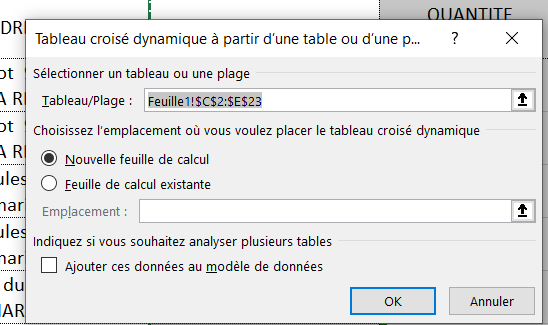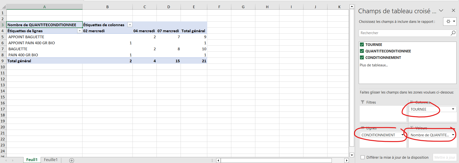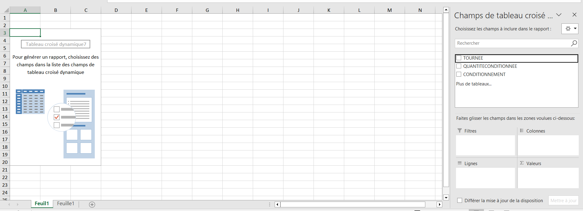 Une nouvelle feuille va se créer contenant un tableau vide. Il suffit alors de glisser déposer TOURNEE dans colonne, CONDITIONNEMENT dans ligne et QUANTITE CONDITIONNEE dans Valeurs :