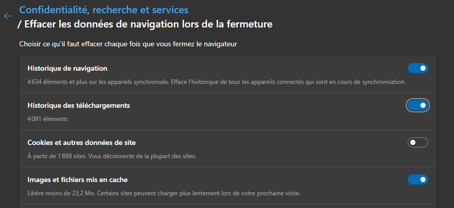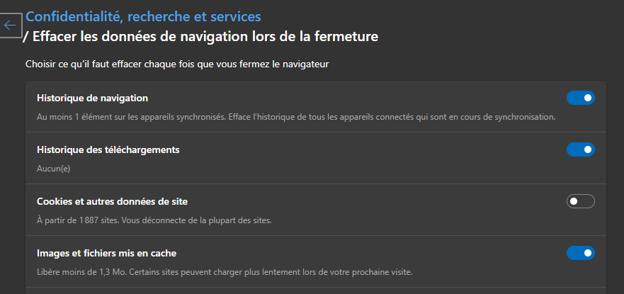 Dans les paramètres aller dans l'onglet "Confidentialités, recherche et services", descendre un peu et "Effacer les données de navigation" :