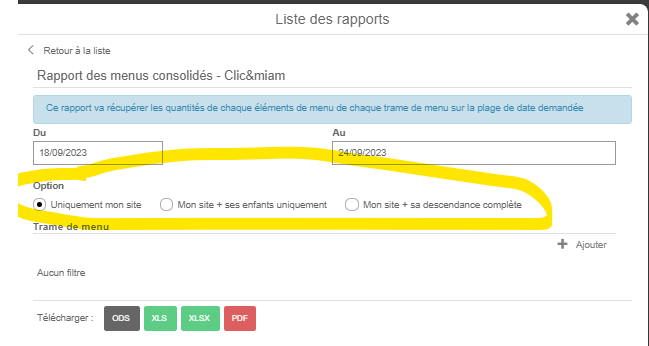 Le rapport de menus consolidés clic&miam présente désormais les options d'exports pour mon site + sa descendance complète. Plus besoin de faire un export PDF puis de modifier PDF dans l'URL par XLSX&withAllChildren=1.