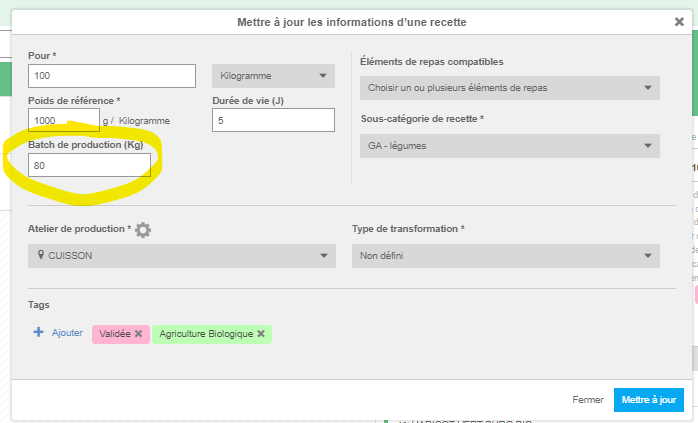 Il est désormais possible de paramétrer des batchs de production pour les recettes.